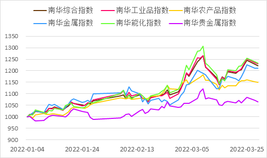 2022年一季度是新冠疫情以来的第三个开年。2021年第四季度对于部分上游大宗原材料商品的过热情绪国家采取强力态度干预,价格随之回落。在经历年末下降之后南华综合指数和各板块指数持续缓慢上涨。春节前后,房地产预期又起, 以金属指数、黑色指数为首各板块指数经历一小轮上涨。随后至二月中下旬,伴随俄乌局势的升级,原油价格引领南华能化指数上升。三月初交火后,欧美制裁使得能化、金属及工业品指数继续拉涨,此外粮食减产担忧推动农产品上涨 、避险情绪引起贵金属指数的一波小高峰。在三月下旬,战争陷入僵局,各类风险资产波动加大,南华各板块指数走势也在国外局势动荡、国内房地产预期及奥秘克隆疫情的发酵等各类事件影响下波动。