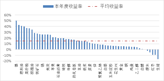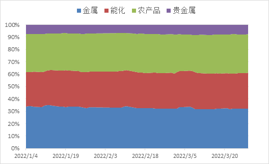 34%左右下降至32%;能化板块从年初的28%左右上涨到30%左右。农产品板块维持在31%左右几乎没有变化。贵金属板块从7.5%左右小幅微升至7.8%。