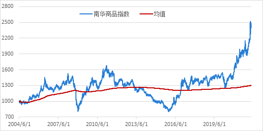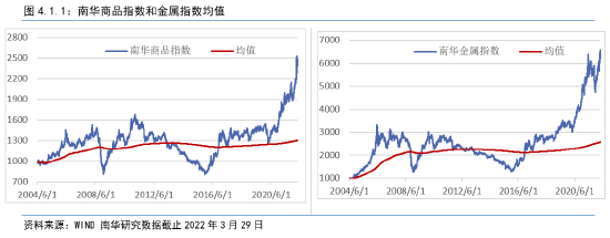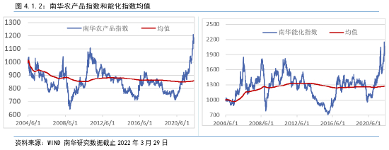 南华商品指数从2004年6月1日编制起始,到当前2022年3月,已经走过了近18年的历程,记录了这段时间以来中国商品市场的跌宕起伏。从图中可以发现,2021年之前,不管价格如何变动,南华商品综合指数始终处于一个区间(800,1700)之间波动,南华商品综合指数均值一直处于区间(1200,1270)之间窄幅波动。如果把南华商品综合指数走势看成南华商品综合指数所代表的一众大宗商品的价格,则南华商品综合指数均值则代表着一众大宗商品的价值。2020年,一季度,南华商品指数实现均值回归,但是没有跌破。2季度,中国对疫情的有力管控,复产复工全面铺开,大宗商品需求爆发性增长;但是供给端,由于国外疫情则是迅速发展和蔓延,停工停产持续发生,导致部分大宗商品供给端出现问题;供应遇阻,需求爆发,叠加各国大量流动性的注入,拉开了大宗商品市场一波接着一波的大牛市上涨行情。2021年1月份,南华商品指数突破2011年高点,打开了南华商品指数上方的空间。2021年2季度,在房地产市场繁荣的引领下,叠加强劲的出口,南华商品指数一波上扬至1974点。7月份,一张发改委关于各个地区的能耗预警图引发市场关注,部分地区发电量大幅上涨,耗煤量快速上升,动力煤价格飙升,发电厂出现亏损,发电意愿大幅下降。动力煤价格上涨引发一系列与之相关商品跟随,限产导致供应端大幅减少,惜售、投机风潮显现,期现互动,推动价格上涨形成“正反馈”,部分品种进入暴涨状态,并带动南华商品指数再度创出新高2128。10月份,在国家强力行政干预之下,动力煤价格出现雪崩,相关商品也大幅下挫,部分商品价格跌幅超过50%,南华商品指数重新回到前期高位横盘区域。时间进入到2022年,奥密克戎成为新冠病毒主要的流行病毒,其具有强传播性、低致命性的特点,欧美等国家基本采取与病毒共处、全民免疫的抗疫政策。经济活力增强,之前受阻的人员、货物获得广泛的流通,能源消费逐步增加。与此同时,欧佩克始终维持原定生产计划不变,导致供不应求,拉动能源相关商品价格的上涨。2月底,俄乌冲突爆发,欧美对俄罗斯实施各种经济、金融制裁,市场处于一片恐慌之中,南华商品指数上涨至2524点的高位。