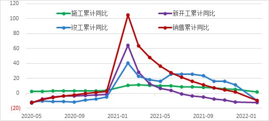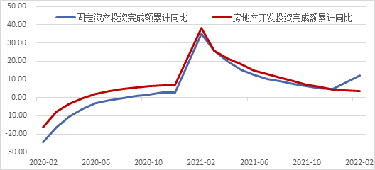 在图3.3.3中,尽管房地产市场投资总额同比依然保持下滑的趋势,但是固定资产投资总额同比则是逆势而上,2月份累计同比达到12.2%,这一增速是在去年高增速基础上实现的。2021年,固定资产投资完成额累计同比都维持在2位数之上,原因在于2020年基数较低的缘故。2022年的同比则是在搞基础之上完成,而且,根据总理报告,后期该数据仍有望保持两位数的增速。