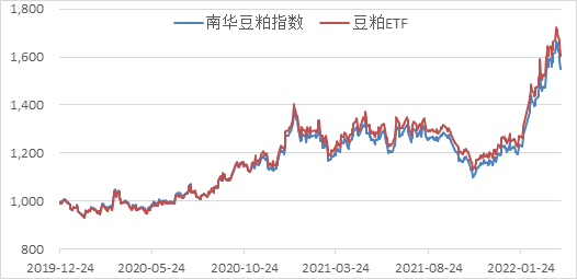 豆粕ETF2019年9月24日基金净值为1,将南华豆粕指数也归为1,截止2022年3月31日,豆粕ETF净值为1.59,南华豆粕指数收益为1.55。从下图对比来看,两者走势基本趋同。