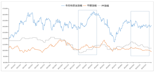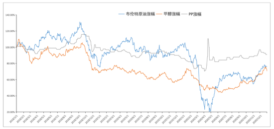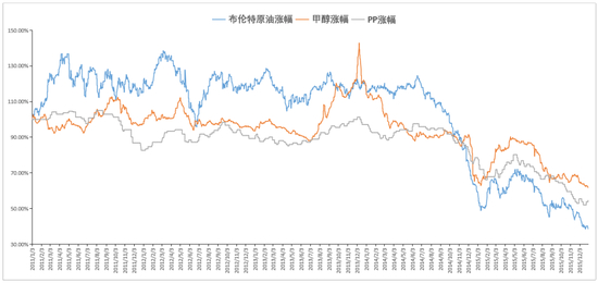 2016年-2018年原油上涨阶段中,原油上涨幅度最高,其次是液体化工品甲醇,最后是PP原料,如下图中: