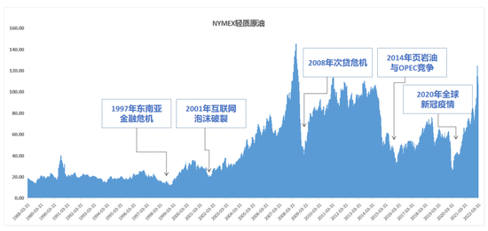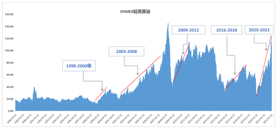 如下图中,原油的价格在2000年,2008年,2012年,2018年,2022年均上涨到相当高的幅度。
