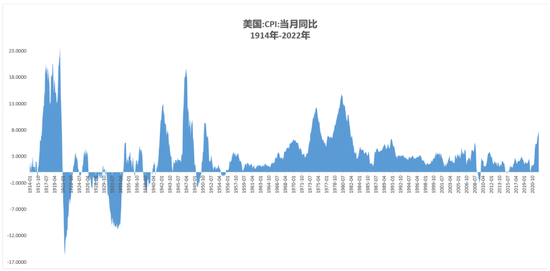 我们再看一下,从1914年至2022年的美国通胀水平数据如何呢?