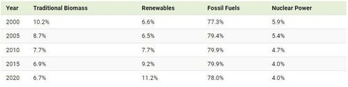 在2000年到2010年的十年间,可再生能源的份额只增长了1.1%。但是2010年到2020年之间,增长速度开始加快,可再生能源的份额保持在3.5%。