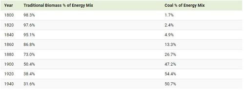 因此,像英国这样的工业化经济体需要一种新的、更便宜的能源。能源转向煤炭,标志着第一次重大能源转型的开始。