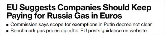 据彭博社报道,根据欧盟指导意见,欧盟公司有可能用欧元或美元付款,然后再由俄罗斯方面将其兑换成卢布,这样既可以满足俄方要求,也不会违反欧盟对俄罗斯的制裁规定。