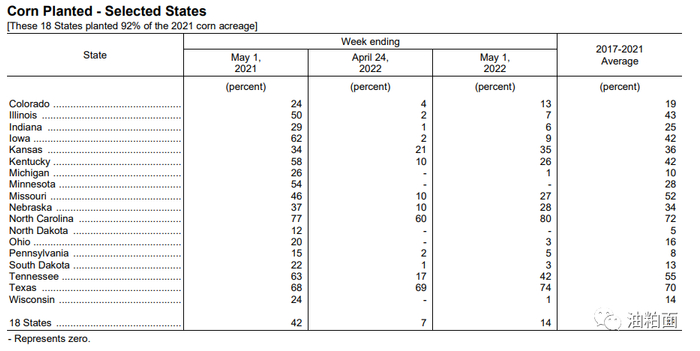 玉米出苗率从一周前的2%上升到了3%,但落后于去年的7%和前五年6%的平均水平,南部各州德克萨斯州(62%)、北卡罗来纳州(56%)和田纳西州(10%)。