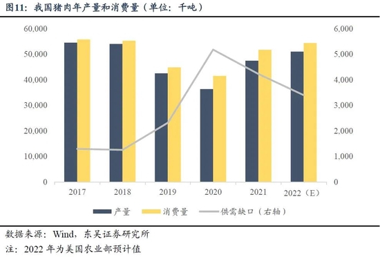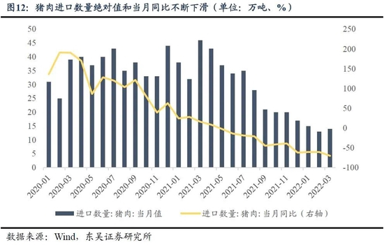 由于我国的猪肉需求量大,即使产能充足,供需之间也存在一定的缺口,需要从海外进口猪肉。以2021年为例,我国猪肉的消费量和产量之间的差值为4226千吨,猪肉的进口数量为3710千吨,基本覆盖缺口。但是,猪肉进口数量绝对值和当月同比不断下滑,进口数量的下滑缓解了猪肉的供给压力,给价格提供了上行的动力。