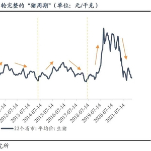 历史上的“猪周期”有何异同:由于生猪当期供应量会受到前一期生猪价格的影响,即养殖户会根据利润情况灵活调整产量,且生猪具有其自身的生长周期,因此生猪价格的波动存在周期性,形成了“猪周期”。我们将每轮“猪周期”的特点总结为两点“同”,一点“异”:(1)如果以22省市的生猪平均价作为衡量“猪周期”的标准,以价格的“谷—峰—谷”作为一轮周期,可以看到从2006年至今,我国经历了3轮完整的“猪周期”,持续时长分别为46个月、47个月和48个月。从周期长度来看,由于生猪具有其自身的生长周期,因此每轮“猪周期”的持续时长均为4年左右,其中价格上涨平均时长为20个月,下跌平均时长为27个月。(2)从每轮“猪周期”开启前的价格来看,生猪价格均会出现“二次探底”的现象。在新一轮上涨周期开启前,能繁母猪存栏量的下降斜率出现放缓,与“二次探底”相对应。针对能繁母猪存栏量的下行斜率出现放缓的原因,我们认为与“猪周期”结束的时间点有关。由于“猪周期”的持续时长在4年左右,因此每一轮周期出现结束迹象时,第一次价格底部均落在4-5月,夏季往往是猪肉消费的淡季,因此真正的去栏要等到冬天的腌腊季,此后能繁母猪的存栏量会出现显著的下行,新一轮“猪周期”的价格上行阶段开启。(3)从价格上涨和下跌的幅度来看,各轮周期之间的幅度差异较大。