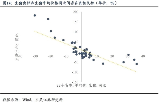 上一节中,我们梳理了影响本轮“猪周期”价格变化幅度的因素,需要指出生猪产能去化幅度是最关键的变量,能繁母猪的存栏量会影响生猪的出栏量,进而令生猪的价格出现波动。通过观察2009年Q1-2022年Q1的生猪出栏同比和生猪平均价格同比,可以发现两者之间存在着明显的负相关性,即生猪价格会因为生猪出栏量的下降而上升。