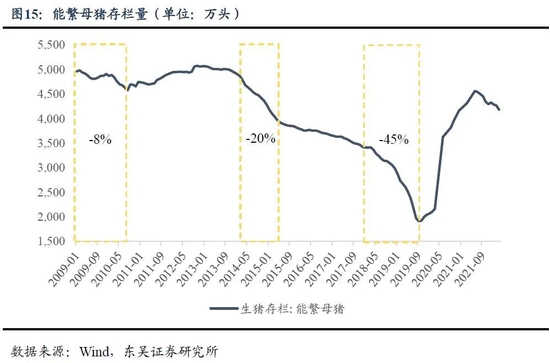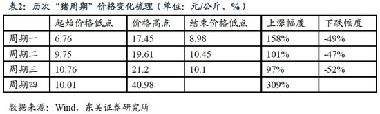 (3)从价格变化幅度来看,其与能繁母猪去化幅度有关,如2019年的非洲猪瘟令能繁母猪存栏量降至2009年以来的低位,相应的价格上涨幅度也是历轮周期中最大的。