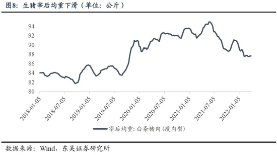 生猪出栏均重与生猪价格之间存在互为因果的关系,其中的逻辑链条可进行如下概括:当养殖户预期猪价将上涨时,会出现压栏的情况,而预期猪价会下降的时候,会让猪提前出栏。由于在“猪周期”下行阶段中养殖利润的下降,导致生猪提前出栏,均重下滑,从而缓解了2022年猪肉的供给压力,价格将缓步上行。截至2022年4月15日,自繁自养生猪和外购仔猪的养殖利润分别为-531.7元/头和-314.03元/头,未摆脱负值区间,自2021年12月以来趋势性下行。与之对应的是猪肉宰后均重的下滑,截至2022年4月1日,黑龙江、北京、江苏等全国16个省市的白条猪肉宰后均重为87.64公斤,同样于2021年12月开始出现趋势性下滑。但是,一旦新一轮“猪周期”开启,养殖户对于利润上行的共识确立,就会出现压栏的情况,造成供给后置,这反而会加剧生猪价格上行的幅度,根据我们上文对于本轮“猪周期”的判断,共识或形成于2023年一季度。