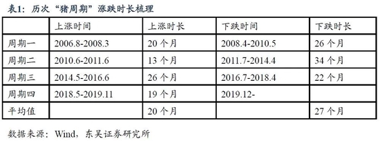 (1)从周期长度来看,由于生猪具有其自身的生长周期,因此每轮“猪周期”的持续时长均为4年左右,其中价格上涨平均时长为20个月,下跌平均时长为27个月。