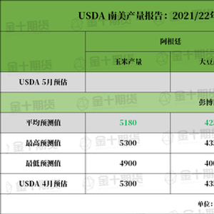 USDA将于北京时间5月13日凌晨0点公布5月供需报告。本次报告将首次公布2022/23作物季的数据,交易员将密切留意,判断新作年度的供需情况。此外,对于近期印度高温天气对全球小麦市场形成的供应紧张影响,以及美豆、玉米产区不良天气导致的播种延迟问题,本次报告将有所体现。根据路透和彭博社最新调查显示,预计USDA将会下调2021/22年度(旧作)美国玉米、大豆的农作物期末库存预估。