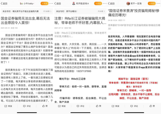 从维权文章或帖子的内容来看,往往大同小异、似是而非。先给出曝光平台名称,再以投资者的口吻介绍“上当受骗”经历,包括:平台业务员承诺“高收益零风险”,购买咨询服务后产生大量投资亏损;被拉到股票群缴纳服务费,但亏损越来越多;购买专业软件后亏损越来越多……方式方法林林总总,关键字却总离不开“服务费”、“亏损”和“受骗”。