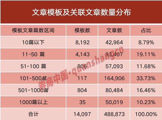 数据还显示,有约50000篇“代理维权”文本套用了35个模板,其中有10个模板涵盖的文章数量均超过1500篇,使用率最高的一个模板甚至出现在3211篇文本中。