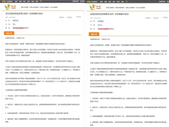 甚至于,在各类搜索引擎上搜索证券、期货、投资咨询公司名字,都能看到诸多维权信息,这些信息大同小异、真伪难辨。网络上出现了不少维权个体或机构,号称自己是专业的律师团队,能够迅速帮助投资者讨回在非法交易平台的经济损失。