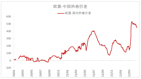 俄乌战争后欧洲原料及成品价格跳涨,原料推涨成品价格趋势明显,总体价格区间已到至近两年高位。于此同时热卷、板坯等内外价差拉大,国外订单流向国内各大钢厂,导致国内板材价格高企。海外成本端由于欧美等国家对俄罗斯能源的制裁,煤炭等能源价格飙升,天然气价格同比涨幅达到280%,叠加高位高通胀-高工资螺旋上升,整体欧美形成原料成本、人员成本提升,成品价格居高不下。4月份开始,伴随着欧洲第一波补库完毕,海外成材价格高位松动回落,但内外价格依旧处于历史高位,或许只有俄乌冲突缓解全球供应回升或国外需求直线下行时,价差才有希望回到水平。