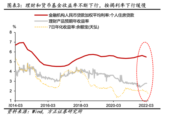 居民提前偿还房贷意愿提升是因为低风险资产收益率降低,而按揭利率刚性偏高。居民提前偿还房贷意愿的提升,可能与低风险资产收益率下行有关。今年以来,央行通过MPA考核、改革银行存款定价市场化改革等方式来推动银行存款成本下行,这推动银行存款成本逐步回落。作为存款替代产品的货基收益率和理财收益率也逐步下行。截止4月11日,全市场理财产品收益率为2.8%,回落至了3%以下。面对5.5%的住房贷款加权平均利率,资产收益率和负债成本率的缺口不断扩大,居民提前偿还房贷的意愿提升。