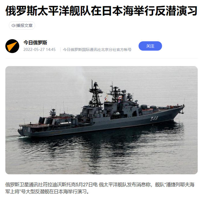 俄罗斯太平洋舰队最近也是动作频频。俄罗斯卫星通讯社符拉迪沃斯托克5月27日电,俄太平洋舰队发布消息称,舰队“潘捷列耶夫海军上将”号大型反潜舰在日本海举行演习。该消息称:“演习期间,‘潘捷列耶夫海军上将’大型反潜舰船员演练组织搜索潜艇的任务。在发现假想敌潜艇后,反潜舰船员演练对潜艇使用反潜武器并组织对水下目标跟踪。”