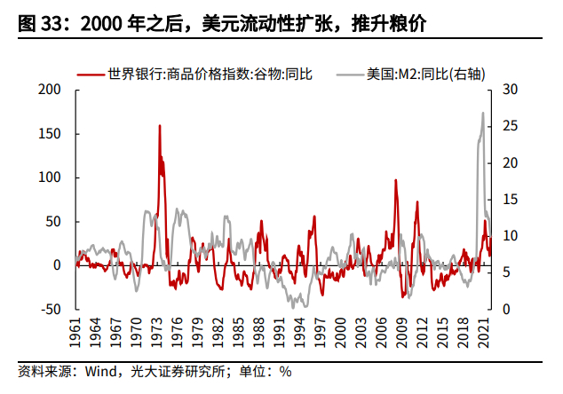 美国通过长期超发美元,以推动宽松货币政策,刺激本国经济增长,持续向全球范围内注入流动性。石油和粮食成为吸纳美元过剩流动性的完美场所,既防止本土出现大幅通胀,同时也成功地转移美元危机,并且向外输出通胀,对外粮食依存度较高的发展中国家,不得不承受严重的社会动荡。
