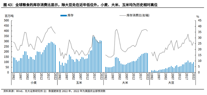 但从库存、供需等基本面角度而言,粮价并不具备如此高的上涨基础。尽管近年来小麦、玉米库存持续回落,但仍处在历史高位,明显高于2008年粮食库存水平。