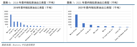 制裁前(2018年)委内瑞拉原油出口的种类有16种,其中Morichal油品出口2384万吨,占比最高达到34%,原油、马瑞、Zuata 30/Hamaca Blend等油品,占比分别为15%、15%和12%,其余油品出口不足10%;而制裁后(2021年)委内瑞拉原油出口种类降至8种,马混成为最大的出口油品,占比高达55%,其次是Hamaca Blend(17%)、Crude Oil(11%)、Morichal(5%)、马瑞(Merey)(5%)、Diluted Crude Oil(4%)、Leona 22(2%)和Zuata 30/Hamaca Blend(1%)。