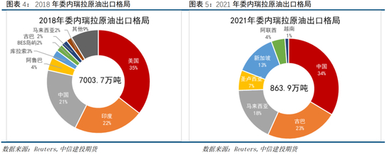 制裁前(2018年)委内瑞拉原油出口国数量众多,前三国分别为美国(35%)、印度(22%)和中国(21%),而制裁后(2021年)中国跃升至第一位置,原油出口量占比34%,此后出口国依次为古巴(23%)、马拉西亚(18%)、新加坡(13%)、圣卢西亚(7%)、阿联酋(4%)和越南(1%),出口国家数量降至7国;