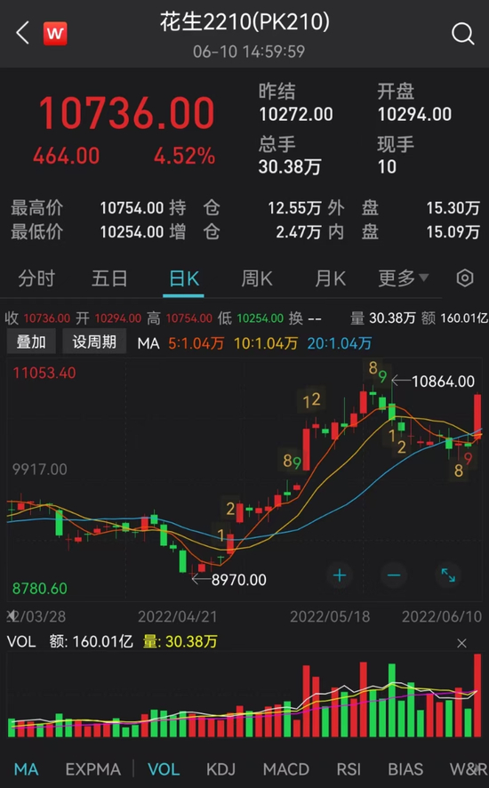 经过半个月的回调后,昨日花生盘面价格突然启动涨势,主力合约PK2210增仓上行,上涨逾4.5%,期价突破10700元/吨的关口,创一周以来的新高。