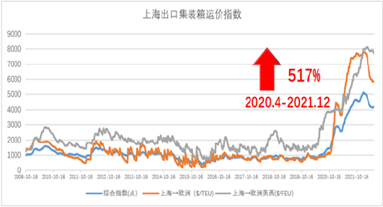 海运是贸易的派生需求,受到政治、经济、文化、天气、疫情、战争等各方面因素影响,市场波动较为剧烈,尤其新冠疫情在全球爆发之后运价波动有加剧之势。受运力供需错配影响,2020年4月至2021年12月期间上海出口集装箱运价综合指数从818.16点上升至5046.66点,涨幅达到517%。