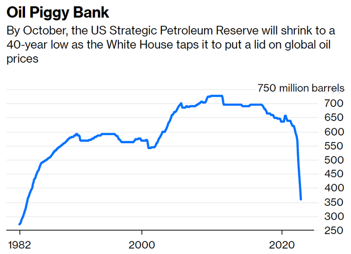一年前,位于德克萨斯州和路易斯安那州的四个存储点拥有6.21亿桶石油的战略储备。但如上图所示,如果美国政府坚持以目前的速度释放SPR,到10月底,石油储备将缩减至3.58亿桶的40年低点,届时将释放掉此前所约定的数量。