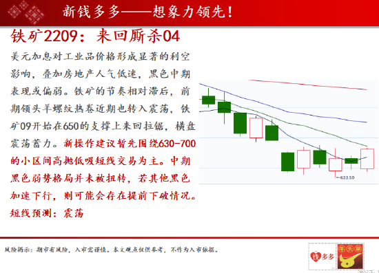 基本面概述:美元加息对工业品价格形成显著的利空影响,叠加房地产人气低迷,黑色中期表现或偏弱。铁矿的节奏相对滞后,前期领头羊螺纹热卷近期也转入震荡,铁矿09开始在650的支撑上来回拉锯,横盘震荡蓄力。