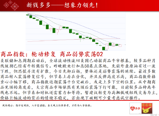 操作建议:美联储加息周期启动后,全球流动性流回美国已动摇商品牛市根基,较多品种月线级别已经有牛转熊信号。昨晚欧央行加息50基点落地,先前外盘原油有过一波下跌,但恐慌并没有扩散,今日先抑后扬,整体还是弱势震荡的延续。最近多数商品转入震荡修复信号,但节奏上存在分化,并且反弹高度不高,商品指数价格重心小幅下移,商品指数近期震荡平台突破后,或是上多下空的位置。从中期商品见顶的角度看,大宗商品市场依然有见顶后震荡下行可能,目前较多品种离年线也不远。但节奏和时机还需蓄力和等待。暂建议转变为高抛低吸短线交易为主,价格巨幅波动的背后的情绪不稳定,若出现下破则可少量考虑试空操作。