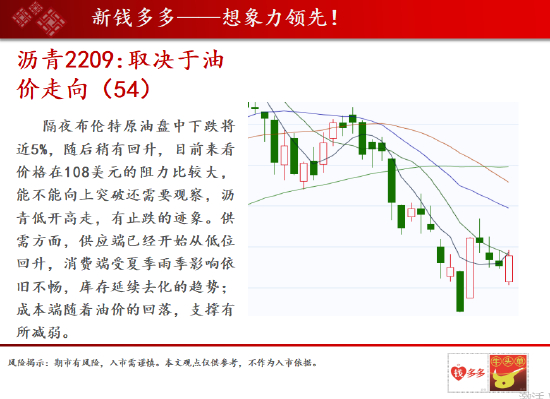 操作建议:隔夜布伦特原油盘中下跌将近5%,随后稍有回升,目前来看价格在108美元的阻力比较大,能不能向上突破还需要观察,沥青低开高走,有止跌的迹象。
