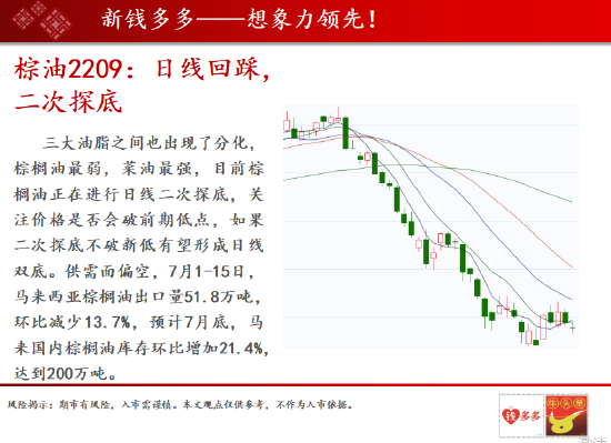 基本面概述:供需面偏空,7月1-15日,马来西亚棕榈油出口量51.8万吨,环比减少13.7%,预计7月底,马来国内棕榈油库存环比增加21.4%,达到200万吨。
