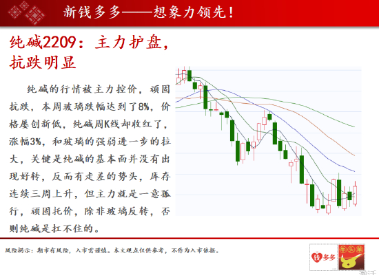 基本面概述:纯碱的行情被主力控价,顽固抗跌,本周玻璃跌幅达到了8%,价格屡创新低,纯碱周K线却收红了,涨幅3%,和玻璃的强弱进一步的拉大,关键是纯碱的基本面并没有出现好转,反而有走差的势头,库存连续三周上升