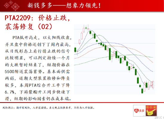 操作建议:PTA低开高走,以大阳线收盘,并且盘中价格还创下了周内最高,从日线形态上看行情止跌的信号比较明显,可以判定持续一个月的大跌暂时结束了,短期价格在5500附近震荡蓄势。