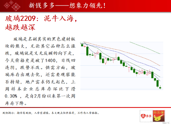 操作建议:玻璃是名副其实的黑色建材板块的熊大,无论其它品种怎么涨跌,玻璃就是义无反顾的向下走,今天价格更是破了1400,日线四连阴,跌势不改。