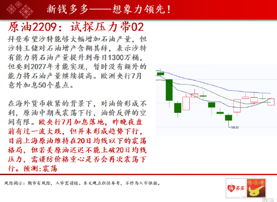 基本面概述:拜登希望沙特能够大幅增加石油产量,但沙特王储对石油增产含糊其辞,表示沙特有能力将石油产量提升到每日1300万桶,但要到2027年才能实现,暂时没有额外的能力将石油产量继续提高。欧洲央行7月意外加息50个基点。在海外货币收紧的背景下,对油价形成不利,原油中期或震荡下行,油价反弹的空间有限。