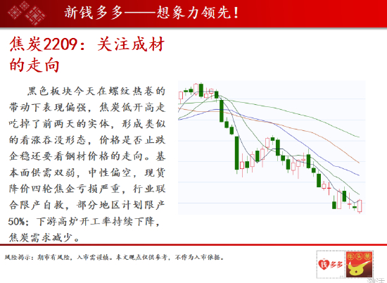 基本面概述:基本面供需双弱,中性偏空,现货降价四轮焦企亏损严重,行业联合限产自救,部分地区计划限产50%;下游高炉开工率持续下降,焦炭需求减少。