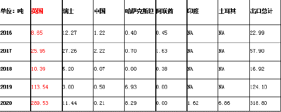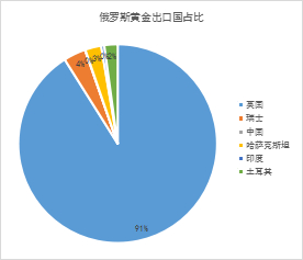 2019年以后,俄罗斯央行的购金行为暂缓,俄罗斯生产的黄金主要通过出口流向全球,其中最核心的出口市场为英国。2020年,俄罗斯生产矿产金331吨,其中出口量总计318.8吨,出口比重超过90%。出口至英国的黄金量为289.53吨,约占俄罗斯黄金产量的88%,其他还有些零星产量则销往诸如瑞士、中国、哈萨克斯坦、印度、土耳其等国。