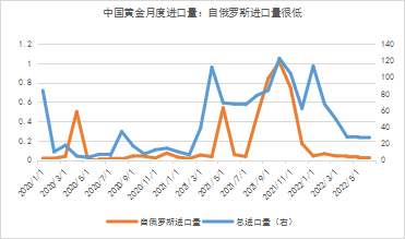 但是从过往中国的黄金进口量及进口来源看,中国从俄罗斯进口的月度黄金量大多在1吨以下,占月度总进口量比重极低。中国黄金进口主要通过中国香港及瑞士两个市场,俄罗斯黄金并非我国传统黄金进口渠道。