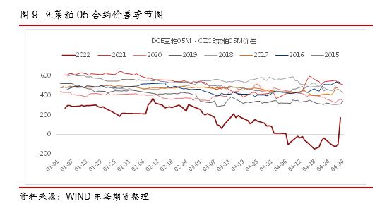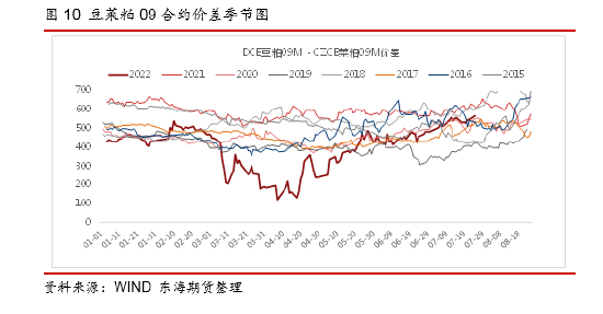 M09-RM09套利合约,在4-8月波动较大,2019、2021年整体处于该时段的两个极端,6-7都有一定程度的上涨,且都在8月出现了修复行情。具体来看,2016年处于区间下沿,5-7月价格集中在350-400;2021年处于区间上沿,5-7月价格集中在550-630。2016年自6月突破历史上限之后,便开始均值回归,一直持续到8约上旬;2022年自4月下旬开始,也开始进入均值回归通道,同时在5-6月出现企稳、在6-7月再出现趋势性上涨行情,均符合季节性价格规律。