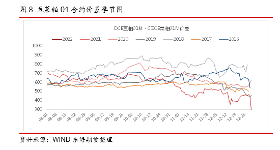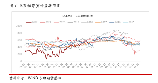 (2)豆粕的疲软行情会使得豆菜粕价差维持在一个同期历史低位水平。由于菜粕的可替代性高,该行情下的豆菜粕价差大概率不会出现极端行情。此外,这种情况下,豆菜粕价差季节性规律会有所加强。