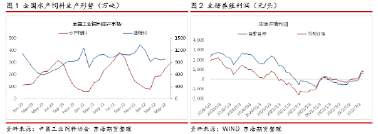 豆菜粕需求的季节性。菜粕季节性消费特点明显,自 11 -明年3 月是水产养殖淡季,水产饲料产量也在全年低位,菜粕进入消费淡季;从5月-10月是水厂养殖旺季,水产饲料产量也在高位,菜粕也相应进入消费旺季。在8月份前后,是产量“倒V”型分布的分水岭,每年前三季度,菜粕的需求是持续回升的,且增量明显。豆粕的需求端主要是在生猪、鸡等家禽的饲养领域,豆粕需求的季节性并不那么明显,反而是对家禽的养殖利润非常敏感。