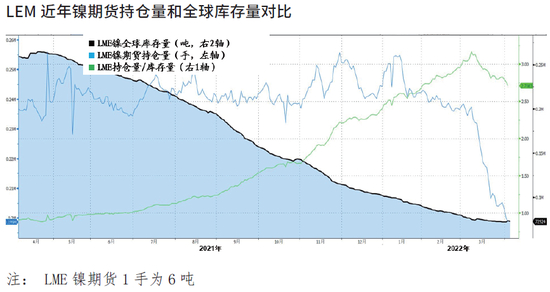 3月7日,LME镍价放量急速上涨,从开盘约2.9万美元/吨上升到最高5.5万美元/吨,日内涨幅最高达89%。与此同时,当日LME镍库存降至7.68万吨,同比下降约70%,接近两年来的新低,但镍合约持仓量则高达117.78万吨,持仓库存比明显失衡。