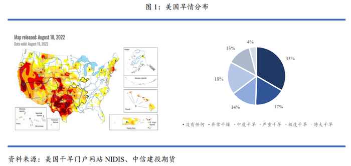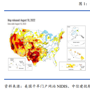 1、美国西部70%地区处于干旱状态,部分地区出现“严重干旱”和“极度干旱”;欧洲多国高温突破历史极值,多国粮食产量减产;中国多日发布红色高温预警,大部分地区存在中度至重度干旱。