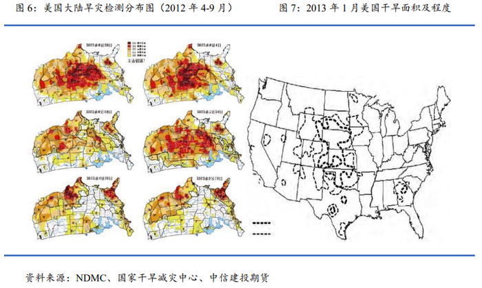 自当年5月以来,干旱伴随着高温肆虐了美国本土一半以上的土地,中西部地区受灾最严重。2012年6月,干旱蔓延到了美国境内68.8%的地区,“严重”和“极端”干旱面积达到24.3%。7月份,美国大陆80%的面积处于不同程度的干旱状态,处于“严重”和“极端”干旱的土地面积比例上升至45.6%。8月份由于部分地区的降水使得干旱土地面积稍有降低,但仍达到国土面积的77%左右,其中“特大干旱”土地面积的比例超过了6%。到2013年1月,中西部绝大部分地区仍然处于特大干旱状态,直到13年3月,严重干旱的面积才陆续减少。2012年美国干旱究其原因,是由于拉尼娜事件让赤道中东太平洋长时间处于冷水控制下,使得大气产生持续的下沉运动,导致热带、副热带地区大气环流系统发生异常变化。