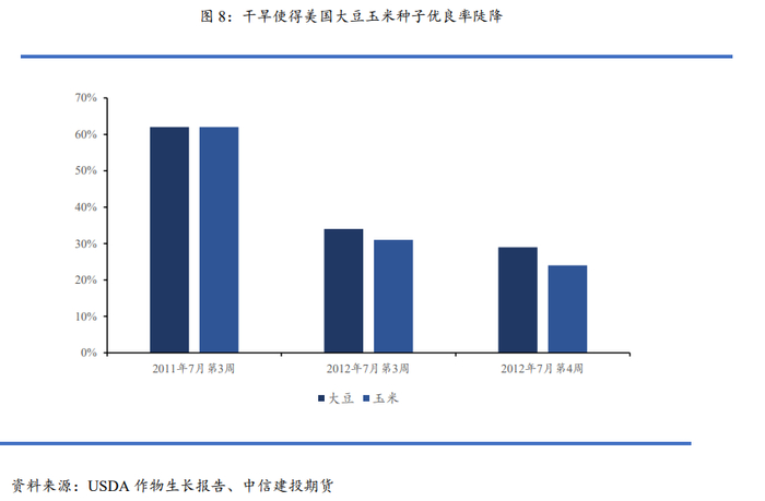 美国此次干旱同样对农业和畜牧业生产造成了巨大的影响。数据显示,此次干旱使得正分别处于抽丝和开花阶段的玉米和大豆的生长优良率直线下降。根据USDA每周公布的作物生长报告,2012年7月15日,美国玉米生长优良率为31%,大豆优良率为34%;而至7月29日,又分别下降至24%和29%,而一年前的同期,玉米和大豆的优良率均达到60%以上。产量方面,2012年美国玉米产量为107.6亿蒲式耳,比2011年下降12.7%,是2007年以来的最低水平;由于2012年玉米种植面积比2011年增加了4.9%,因此2012年平均每英亩单产将比2011年降低16.6%,是1996年以来最低值。2012年美国大豆产量为82.79百万吨,比2011年下降14.1%;每公顷单产为2686.7公斤,比2011年降低了4.8%,是2009年以来最低值。